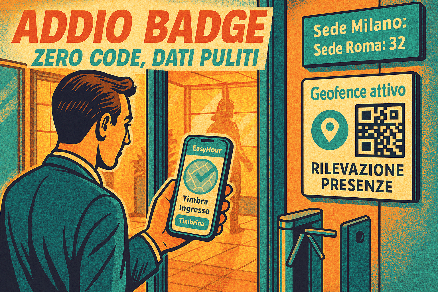 Le code in ingresso costano minuti e pazienza. Con EasyHour i dipendenti timbano da smartphone all’interno del perimetro aziendale o tramite QR di reception: flusso scorrevole, niente hardware proprietario.